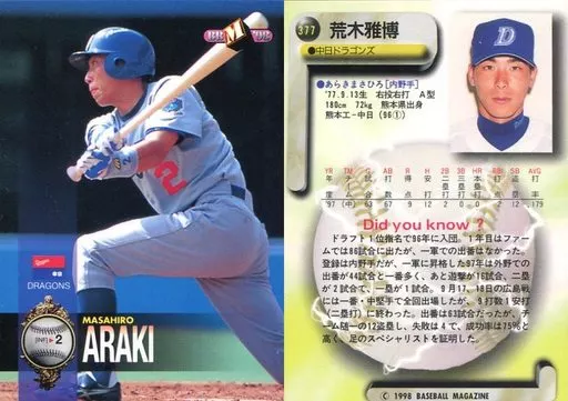 Japanese title: BBM/レギュラーカード/中日ドラゴンズ/BBM’98 ベースボールカード 377 [レギュラーカード] : 荒木雅博