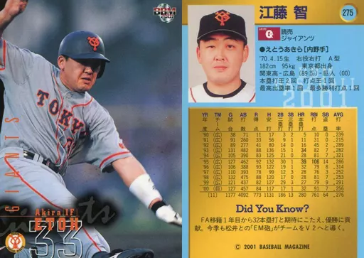 Japanese title: BBM/レギュラーカード/BBM2001ベースボールカード 275:江藤智「読売ジャイアンツ」