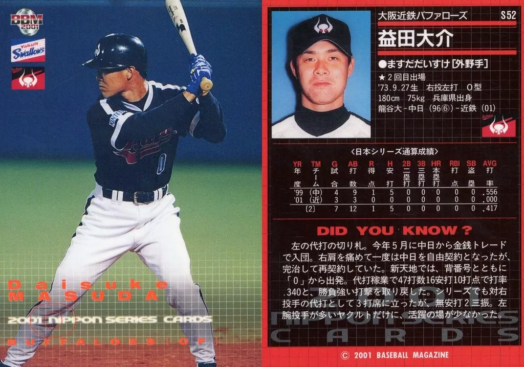 BBM / Japan Series Card / BBM2001 Baseball Card S52 : Daisuke Masuda' Osaka Kintetsu Buffaloes'