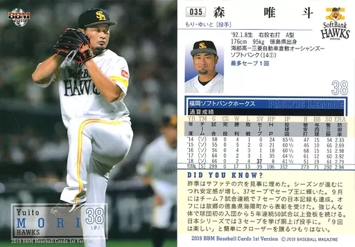 Japanese title: BBM/レギュラーカード/福岡ソフトバンクホークス/BBM2019 ベースボールカード 1stバージョン 035 [レギュラーカード] : 森唯斗