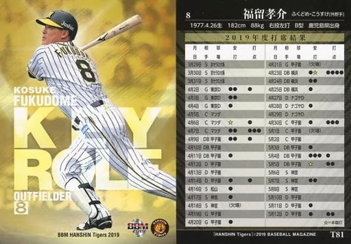 Japanese title: BBM/レギュラーカード/主力野手/BBM2019 阪神タイガース T81 [レギュラーカード] : 福留孝介