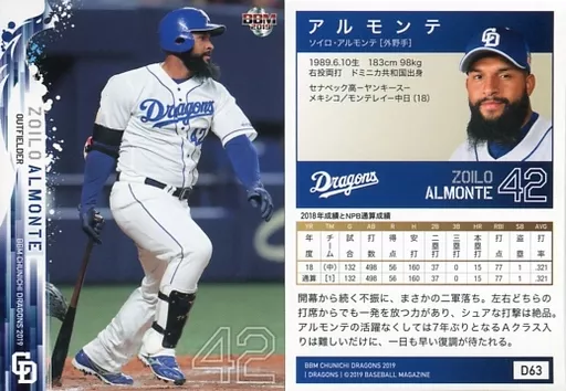 Japanese title: BBM/レギュラーカード/BBM2019 中日ドラゴンズ D63 [レギュラーカード] : アルモンテ