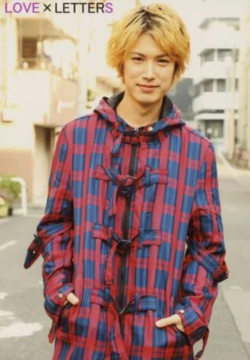 Japanese title: 生写真(男性)/俳優 影山達也/膝上・衣装赤・チェック柄・両手ポケット・屋外・タイトル入り/Reading Cinema×2017Spring Special「LOVE×LETTERS」ブロマイド