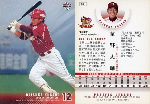 Japanese title: BBM/インサートカード/レギュラーパラレルカード/東北楽天ゴールデンイーグルス/BBM2008 ベースボールカード2ndバージョン[ライトパック] 680 [インサートカード] : 草野大輔(キラ)