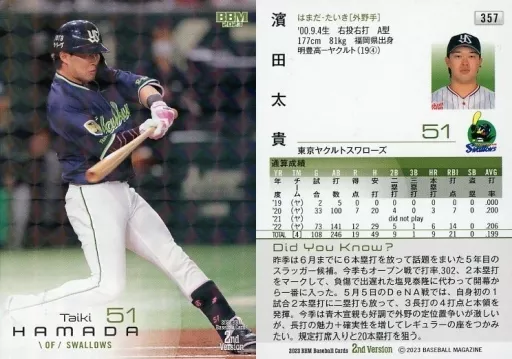 Japanese title: BBM/レギュラーカード/1stバージョンアップデート版/BBM2023 ベースボールカード 2ndバージョン 357[レギュラーカード]:濱田太貴(キラカード版)