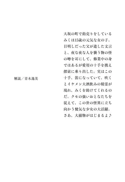 Shueisha Bunko / Miku, una joven vendedora de dulces que sucedió a su padre y se convirtió en una persona brillante, toma un Jutte con un espíritu misterioso que ha sido transmitido de generación en generación y desafía los extraños incidentes que ocurren en la ciudad de Osaka.