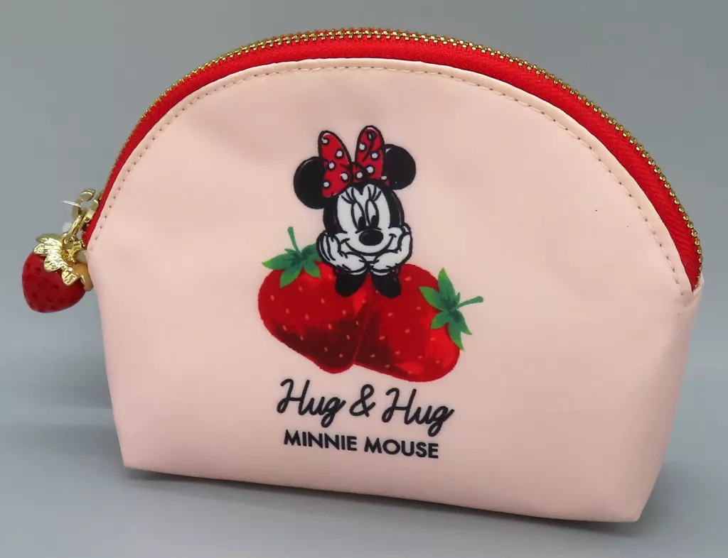 Esta bolsa tiene una imagen de "Minnie Mouse" con su muleta en la parte superior de las fresas, acentuada por el encanto de la cremallera con forma de fresa.