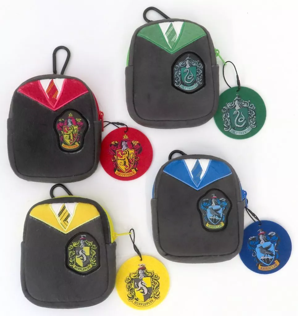Esta es una bolsa diseñada con la imagen de los uniformes de Hogwarts, adornada con el emblema de cada dormitorio.