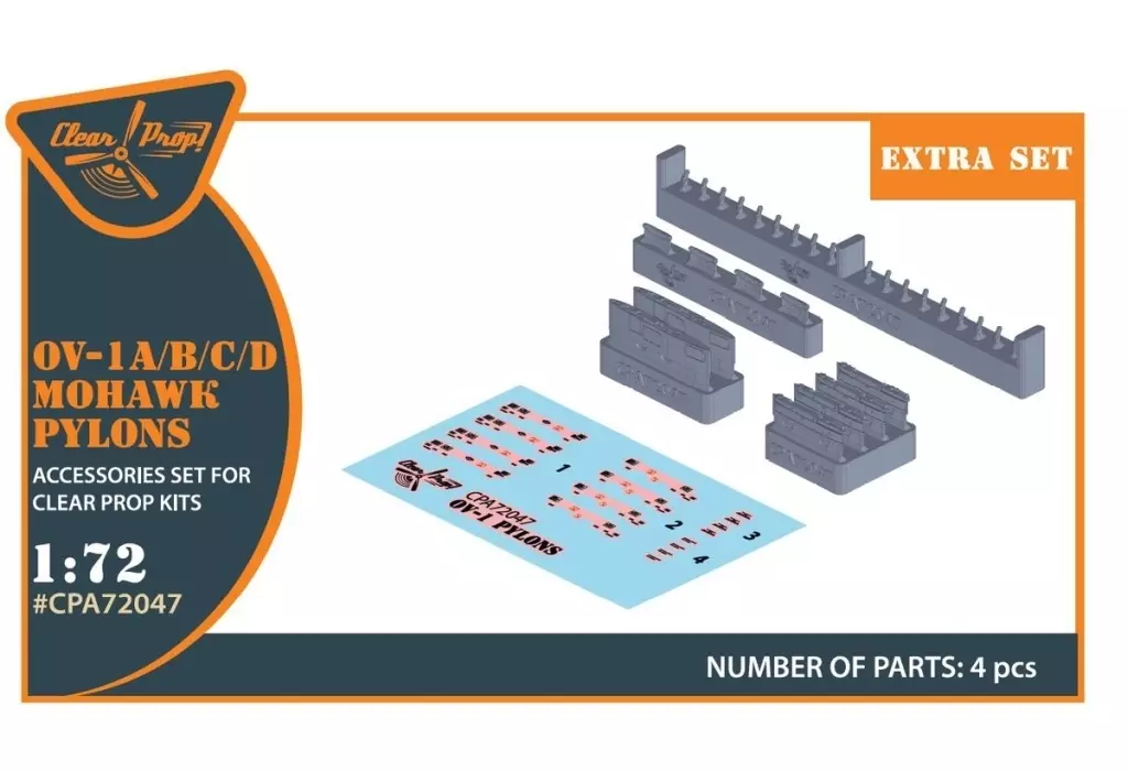 Nombre comercial en japonés: プラモデル 1/72 OV-1A/B/C/D モホーク パイロンセット (クリアープロップ!用) ディティールアップパーツ [CPUA72047]