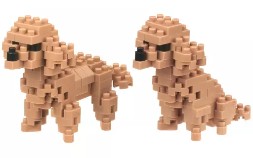 El pelo esponjoso, los ojos desdoblados y las características de un caniche toy se reproducen. Es un conjunto con una figura de pie y una figura sentada.