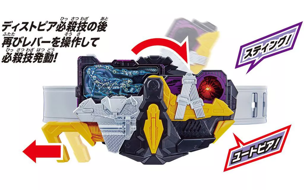 Pulse el botón de la tecla de ascenso de Sting Scorpion adjunta para establecer el elevador de Sting Scorpion. Tire de la palanca para expandir la tecla. Conviértete en un Kamen Rider Fall and Thunder Scorpion!