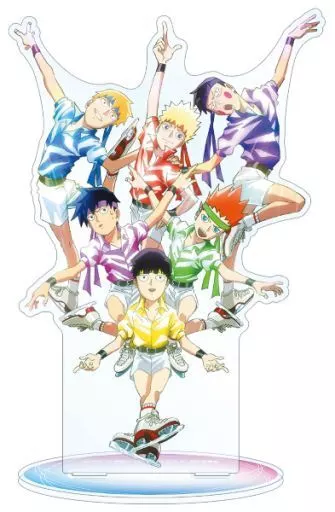 Un gran soporte acrílico con ilustraciones de Shigeo Kageyama, Shinryū Reigen, Equibo, Ritsu Kageyama, 輝気 Hanzazawa y Masaru Suzuki.