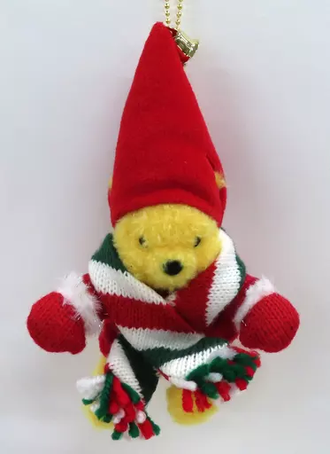 Winnie the Pooh Peluche Badge con un lindo sombrero navideño y bufanda. El diseño del sombrero de Santa Claus con una campana es el punto focal de este artículo.