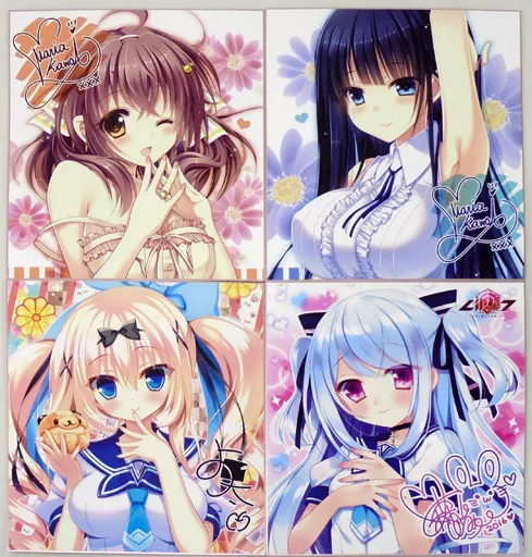 Un juego de 4 hojas de papel de color con ilustraciones en color (impreso) de 4 heroínas.
