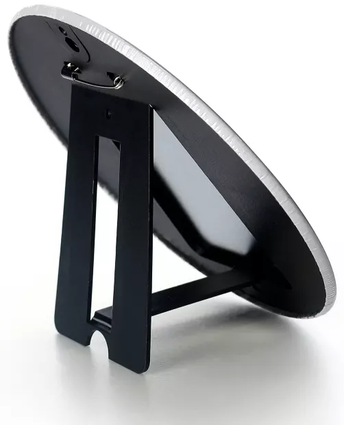En la parte posterior hay un pin, un soporte y una parte para colgar en la pared, por lo que se puede poner de pie o colgar en la pared.