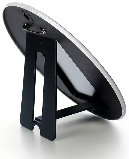 En la parte posterior hay un pin, un soporte y un accesorio para colgar en la pared, por lo que se puede poner de pie o colgar en la pared.
