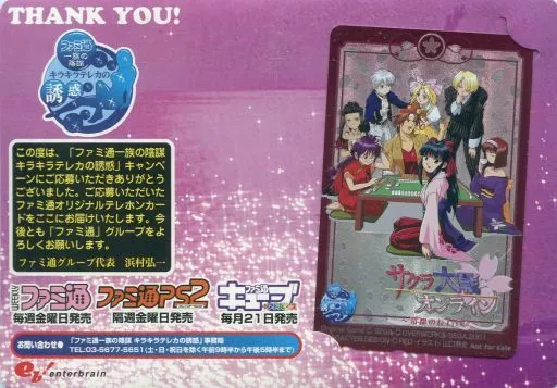 Nombre comercial en japonés: ゲーム・PC系テレホンカード 李紅蘭/真宮寺さくら/神崎すみれ/計8名「サクラ大戦オンライン -帝都の長い日々- [台紙付き]」 ファミ通一族の陰謀 キラキラテレカの誘惑/ホログラム