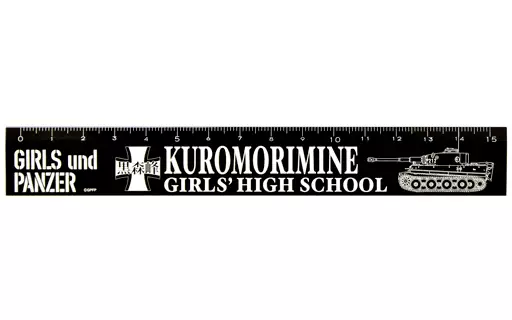 Una regla metálica con un diseño láser de un dibujo de línea de un tanque que representa a Kuromori Ho Jogakuen y un emblema escolar.