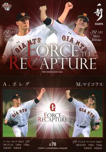 Nombre comercial en japonés: BBM/レギュラーカード/FORCE TO RECAPTURE/BBM2016 読売ジャイアンツ G78[レギュラーカード]:A.ポレダ&M.マイコラス