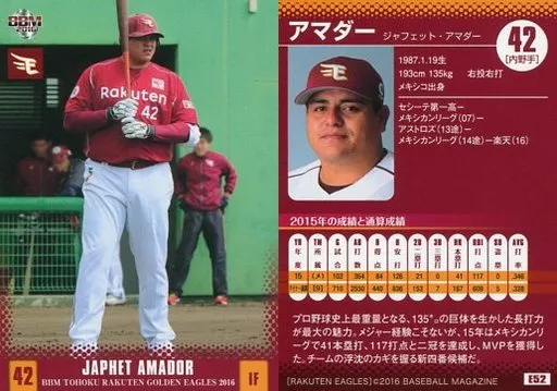 Nombre comercial en japonés: BBM/レギュラーカード/BBM2016 東北楽天ゴールデンイーグルス E52[レギュラーカード]:アマダー