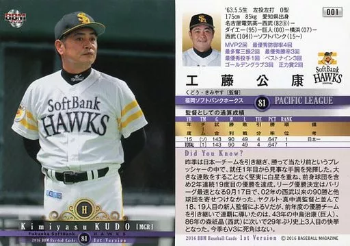 Nombre comercial en japonés: BBM/レギュラーカード/福岡ソフトバンクホークス/BBM2016 ベースボールカード 1stバージョン 001[レギュラーカード]:工藤公康