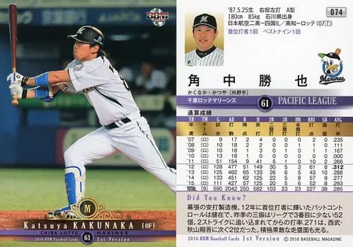 Nombre comercial en japonés: BBM/レギュラーカード/千葉ロッテマリーンズ/BBM2016 ベースボールカード 1stバージョン 074[レギュラーカード]:角中勝也