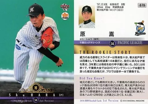 Nombre comercial en japonés: BBM/レギュラーカード/千葉ロッテマリーンズ/BBM2016 ベースボールカード 1stバージョン 079[レギュラーカード]:原嵩