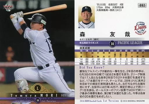 Nombre comercial en japonés: BBM/レギュラーカード/埼玉西武ライオンズ/BBM2016 ベースボールカード 1stバージョン 092[レギュラーカード]:森友哉