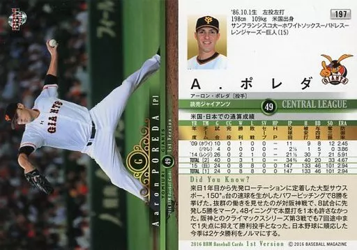 Nombre comercial en japonés: BBM/レギュラーカード/読売ジャイアンツ/BBM2016 ベースボールカード 1stバージョン 197[レギュラーカード]:A.ポレダ