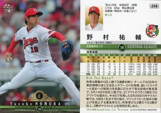 BBM / Regular card / Hiroshima Toyo Carp / BBM2016 Baseball Card primo versión 248 [tarjeta regular] : Yūsuke Nomura