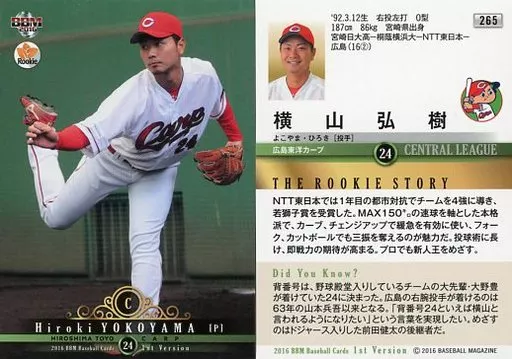 BBM / Regular card / Hiroshima Toyo Carp / BBM2016 Baseball Card primo versión 265 [tarjeta regular] : Hiroki Yokoyama