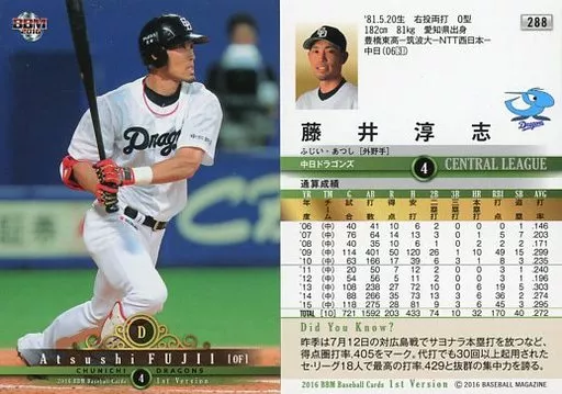 BBM / Regular Card / Chunichi Dragons / BBM2016 Baseball Card primo versión 288 [tarjeta regular] : Atsushi Fujii