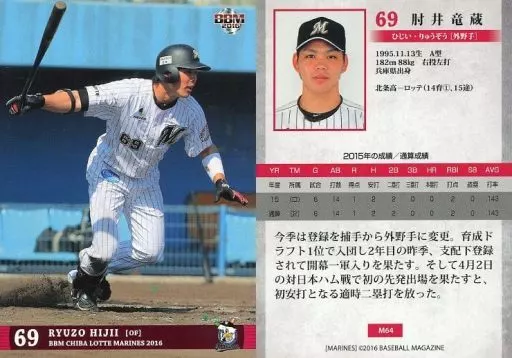 Nombre comercial en japonés: BBM/レギュラーカード/千葉ロッテマリーンズ/BBM2016 千葉ロッテマリーンズ M64[レギュラーカード]:肘井竜蔵