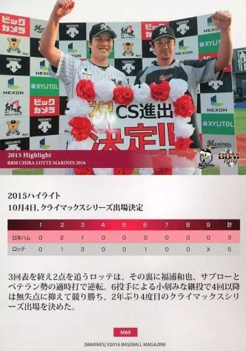 Nombre comercial en japonés: BBM/レギュラーカード/千葉ロッテマリーンズ/BBM2016 千葉ロッテマリーンズ M69[レギュラーカード]:2015CS出場決定