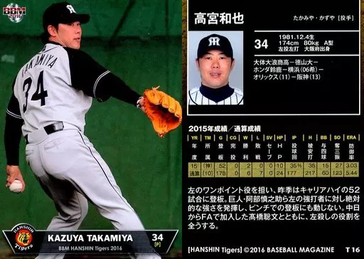 Nombre comercial en japonés: BBM/レギュラーカード/阪神タイガース/BBM2016 阪神タイガース T16[レギュラーカード]:高宮和也