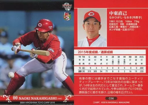 Nombre comercial en japonés: BBM/レギュラーカード/BBM2016 広島東洋カープ C56[レギュラーカード]:中東直己