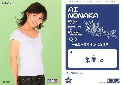 Nombre comercial en japonés: コレクションカード(女性)/DROPS TRADING CARDS LIVE TOUR 2004 センセイ! DROPS はおやつに入りますか !? No.010 : DROPS/野中藍/DROPS TRADING CARDS LIVE TOUR 2004 センセイ! DROPS はおやつに入りますか !?