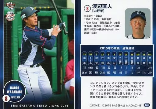 Nombre comercial en japonés: BBM/レギュラーカード/BBM2016 埼玉西武ライオンズ L49[レギュラーカード]:渡辺直人