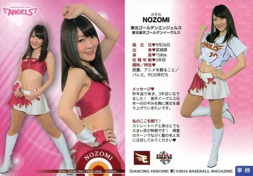 Nombre comercial en japonés: BBM/レギュラーカード/東北ゴールデンエンジェルス/BBM2016 プロ野球チアリーダーカード DANCING HEROINE -華- 華49[レギュラーカード]:NOZOMI