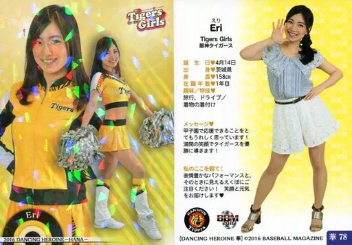 Nombre comercial en japonés: BBM/レギュラーカード/Tigers Girls/BBM2016 プロ野球チアリーダーカード DANCING HEROINE -華- 華78[レギュラーカード]:Eri(ホロパラレル版)