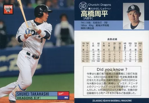 BBM / Regular card / Genko / Chunichi Dragons / BBM2016 Baseball Card CLASSIC 063 [tarjeta regular] : Shūhei Takahashi