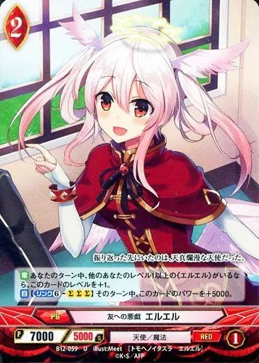 Nombre comercial en japonés: アンジュ・ヴィエルジュ/U/赤/PG/天使/魔法/ブースターパック「たった一つの願い」 B12-059[U]:(パラレル)友への悪戯 エルエル
