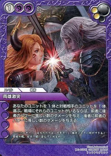 Nombre comercial en japonés: ラストクロニクル/U/スペル/紫/ブースターパック陽光編II 12-058U[U]:(プレミアム)両雄激突