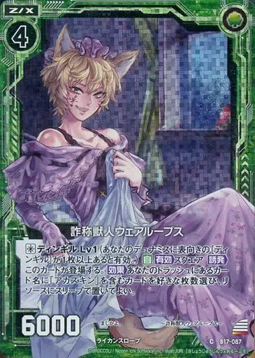 Nombre comercial en japonés: ゼクス/C/ゼクス/緑/第17弾『裏切りの連鎖』 B17-087[C]:詐称獣人ウェアループス(ホログラムレア)