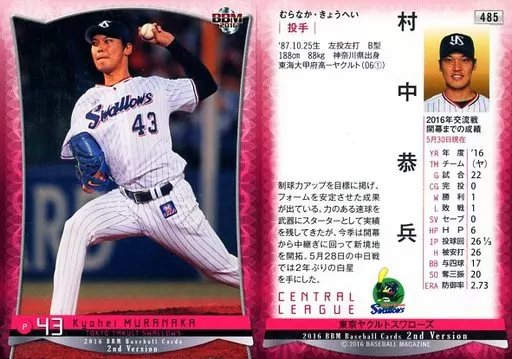 Nombre comercial en japonés: BBM/レギュラーカード/東京ヤクルトスワローズ/BBM2016 ベースボールカード 2ndバージョン 485[レギュラーカード]:村中恭兵