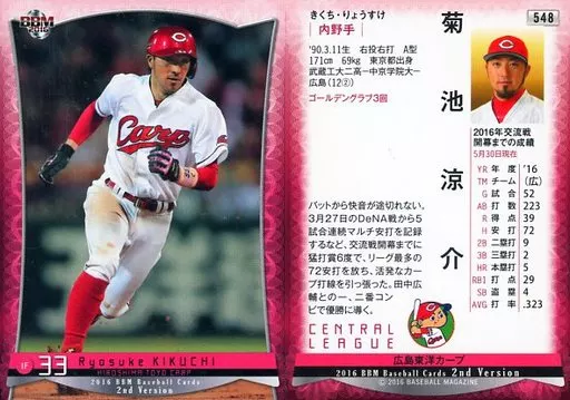 Nombre comercial en japonés: BBM/レギュラーカード/広島東洋カープ/BBM2016 ベースボールカード 2ndバージョン 548[レギュラーカード]:菊池涼介