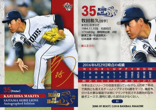 Nombre comercial en japonés: BBM/レギュラーカード/BBM2016 埼玉西武ライオンズ Autographed Edition 「KING OF BEAST」 11[レギュラーカード]:牧田和久(プリントサイン入り)