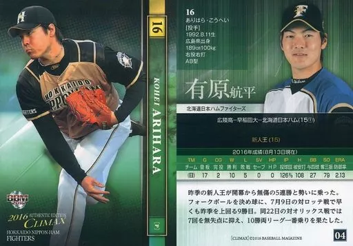 Nombre comercial en japonés: BBM/レギュラーカード/北海道日本ハムファイターズ/BBM2016 北海道日本ハムファイターズ [CLIMAX] 04[レギュラーカード]:有原航平