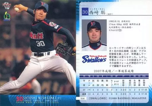 Nombre comercial en japonés: BBM/レギュラーカード/東京ヤクルトスワローズ/BBM2008 東京ヤクルトスワローズ S16[レギュラーカード]:西崎聡
