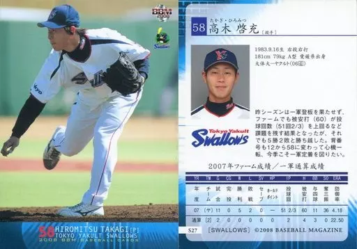 Nombre comercial en japonés: BBM/レギュラーカード/東京ヤクルトスワローズ/BBM2008 東京ヤクルトスワローズ S27[レギュラーカード]:高木啓充